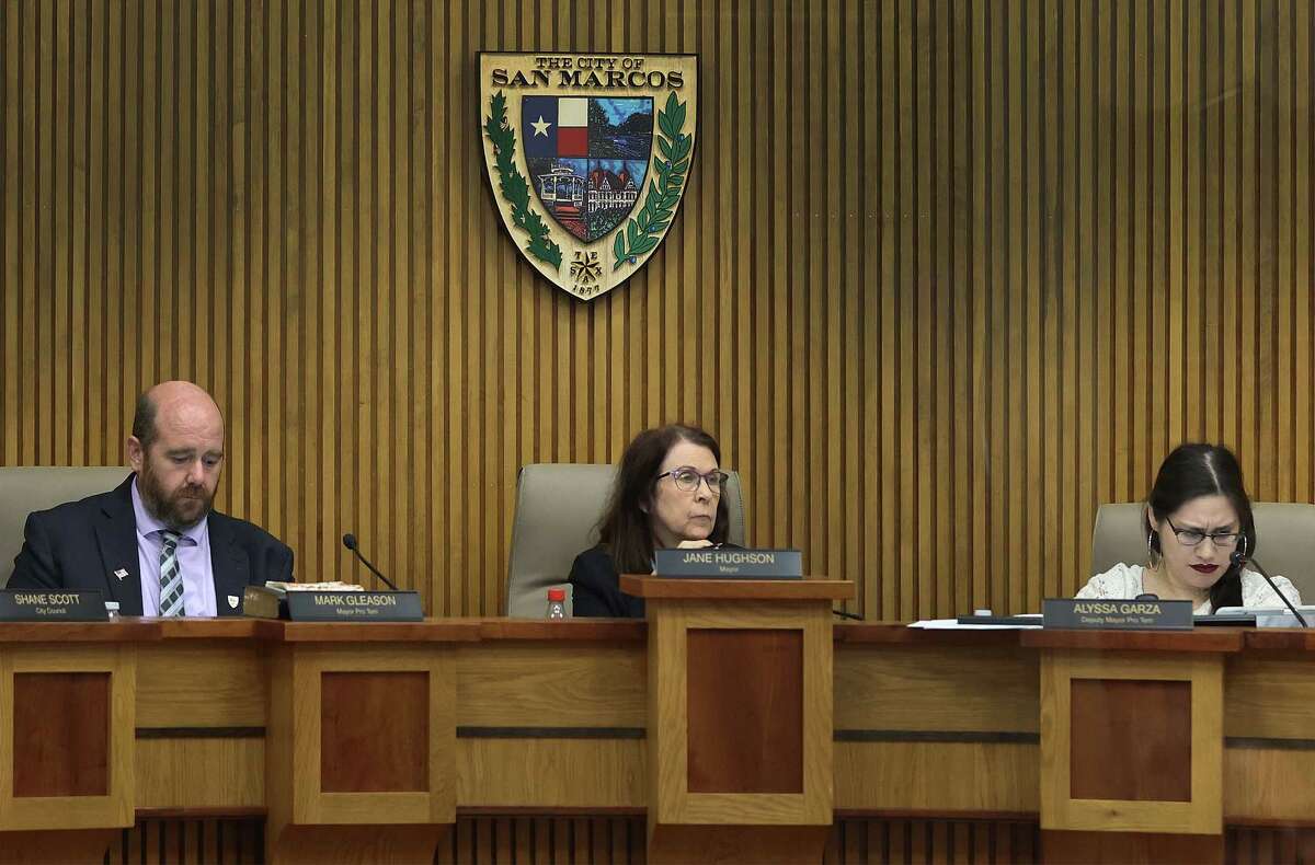 San Marcos City Council Member Mark Gleason, Mayor Jan Hughson and Counci Member Alyssa Garzaare rake part in a recent City Council meeting.