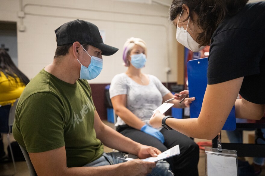 A health care worker translates COVID-19 vaccine information to a patient before he receives a vaccine at a pop-up clinic in East Austin in 2021.