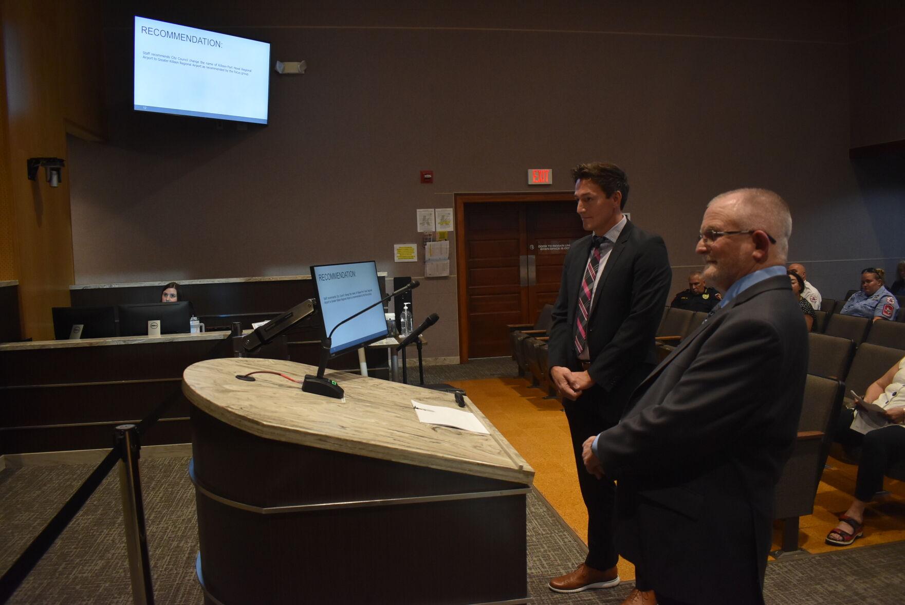 Director of Aviation Mike Wilson, foreground, and consultant Jeremiah Gerald address the Killeen City Council on Tuesday about a proposed name change for Killeen's regional airport.