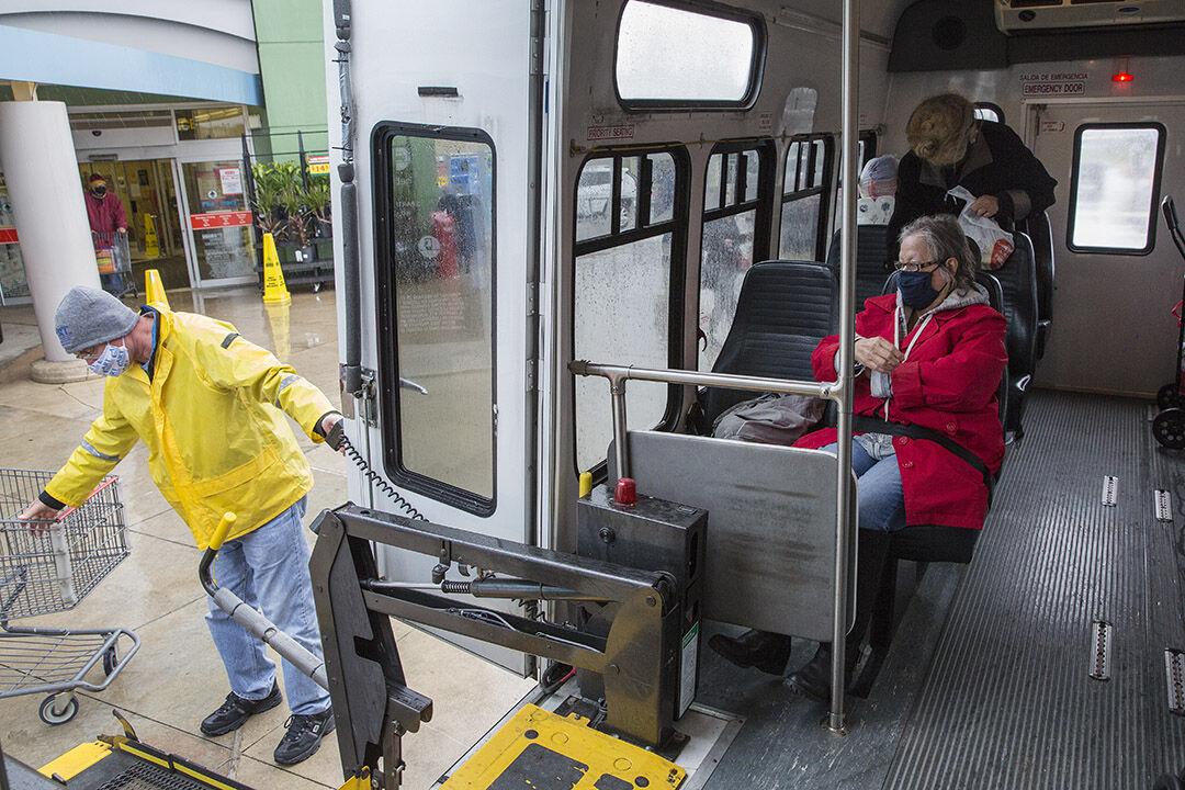 FILE PHOTO: The Alamo Regional Transit bus picks up seniors from their shopping trip at the H-E-B location on South Walnut Avenue on Thursday, Feb. 11, 2021.