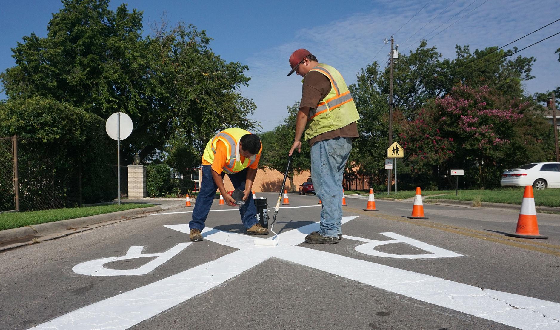 Alex Gonzales dusts fresh road paint with crushed glass specks as he and Jacob Kittrell repaint the railroad crossing marks at the Moss Street crossing just west of Lindsay Street on Tuesday, Aug. 6. The Gainesville city street workers estimated they’d spend a few days freshening up the markings at eight railroad crossings across Gainesville. The glass dust makes the street markings reflective, Gonzales explained.