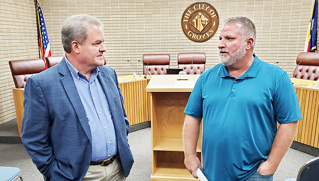 Kevin Carruth, left, speaks with Groves Mayor Chris Borne following Monday’s meeting in which Carruth was selected as the new city manager.