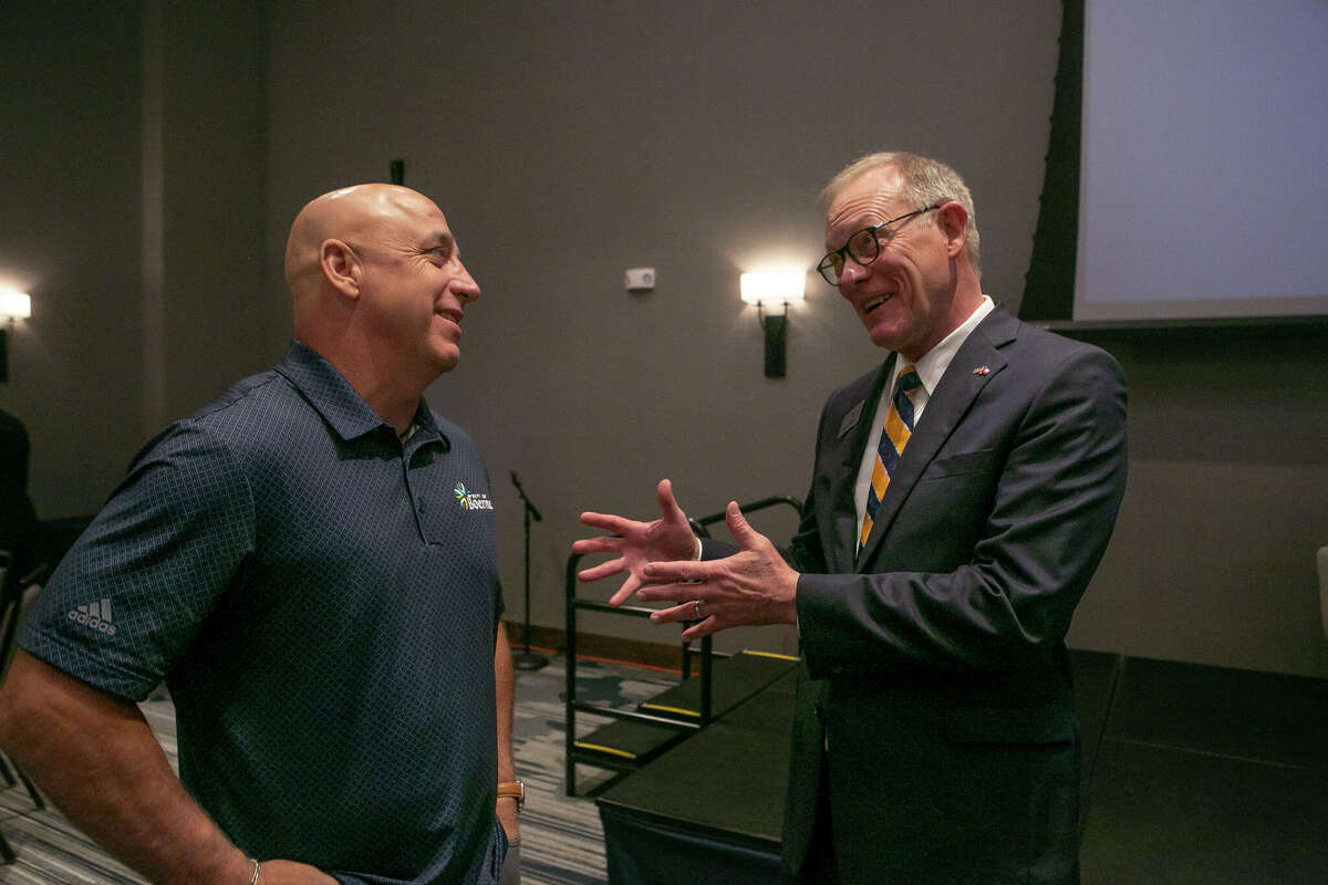 Boerne Mayor Frank Ritchie, left, chats with Steve Mack, CEO of Texas Heritage Bank, at the Boerne State of the City event on Thursday.