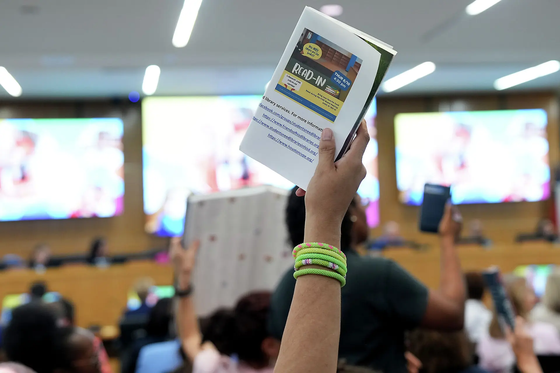 A protester holds up a book during an HISD school board meeting at the Hattie Mae White Education Building on Thursday, Aug. 10, 2023 in Houston.