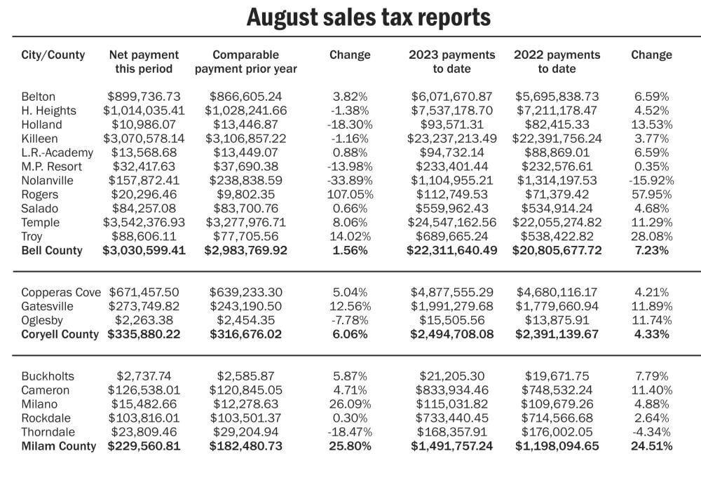 Central Texas exhibited mixed economic signs compared to August of last year. Milam County recorded a strong increase compared to the same month in 2022 and Coryell County also received a healthy increase, but the allocation for Bell County this year was close to the same as last year.