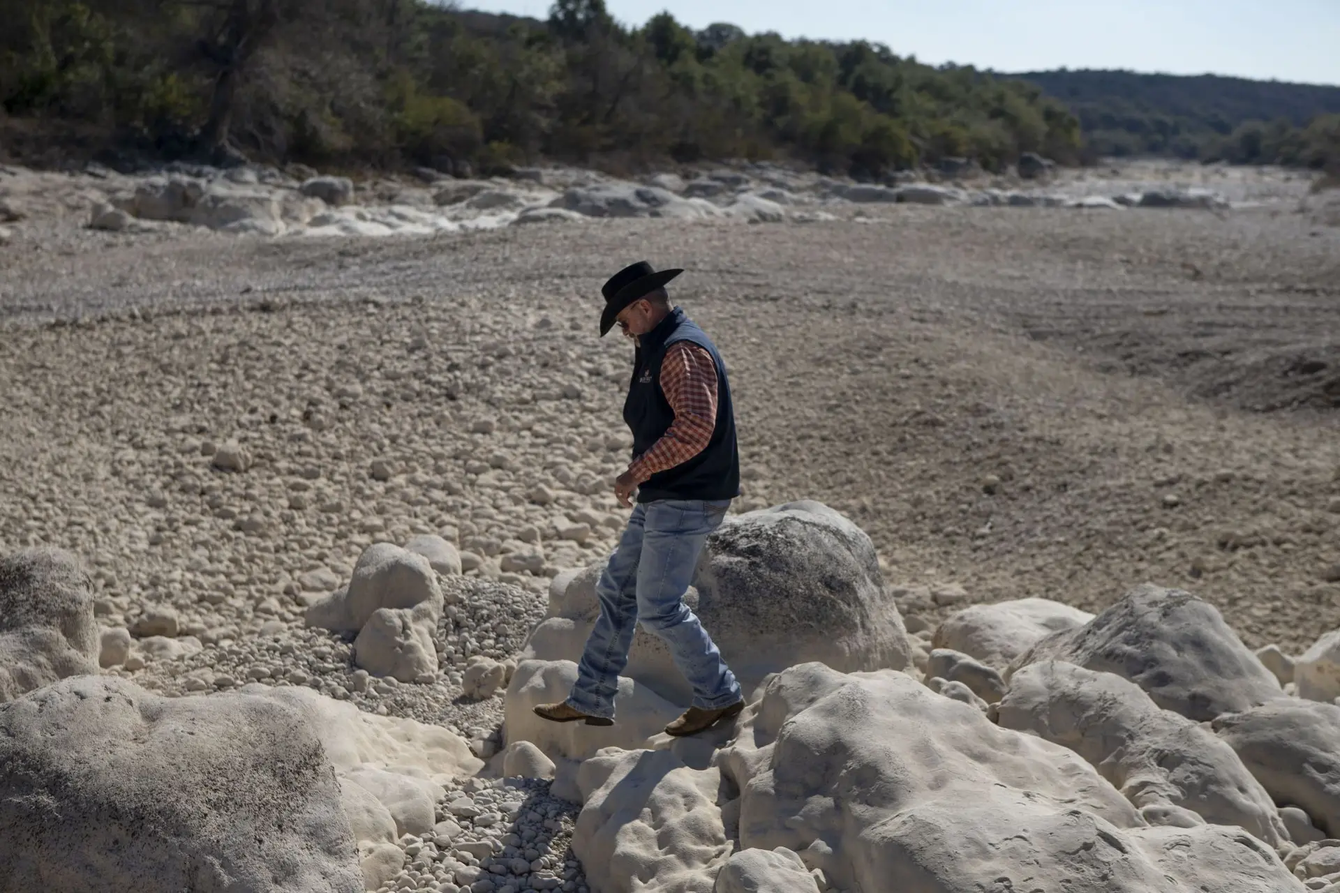 Dripstone Ranch Supervisor Farron Sultmeier walks along the dry riverbed of the Frio River at the ranch in Sabinal, Texas, Feb. 14, 2020. The Edwards Aquifer Protection Program has spent more than $260 million in sales tax funds since 2000 to acquire about 160,000 acres of sensitive land over the aquifer. The program paid a local developer, Pat Kennedy, nearly $8 million for an easement: a permanent restriction on most development.