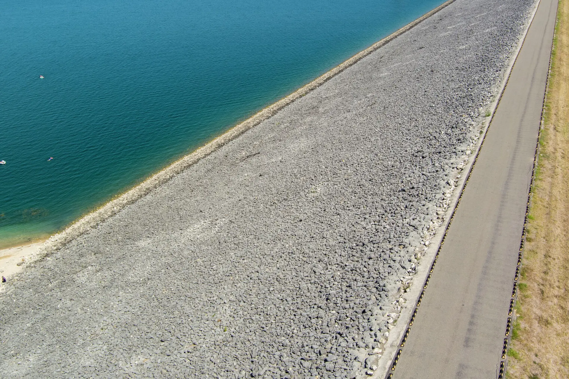 People are seen Wednesday, Aug. 17, 2022 at the Canyon Lake dam overlook park at Canyon Lake. The lake is about 88 percent full or almost 6 feet below normal conservation pool, marked by the debris line on the lake side of the dam. The Guadalupe River has been dry above the lake since late May and the lake has been releasing less than half its historical average amount of water for most of the summer according to the Texas Water Development Board’s Water Data For Texas website.