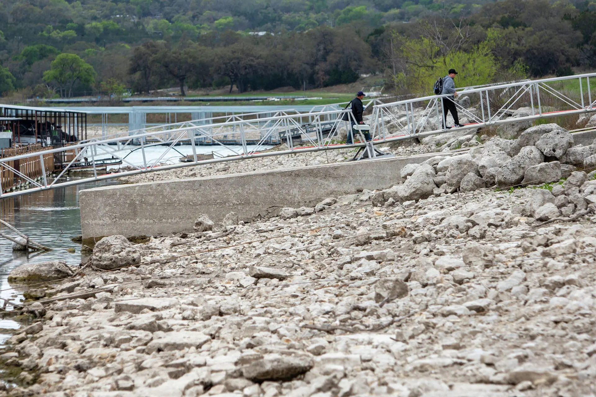 People walk the ramp to the parking lot Wednesday, March 15, 2023, at Canyon Lake’s Cranes Mill Marina as the lake dropped to 77 percent full Wednesday and 11.50 feet below conservation pool, according to the Texas Water Development Board’s Water Data for Texas website. That level approaches the reservoir’s lowest springtime level in over 30 years.
