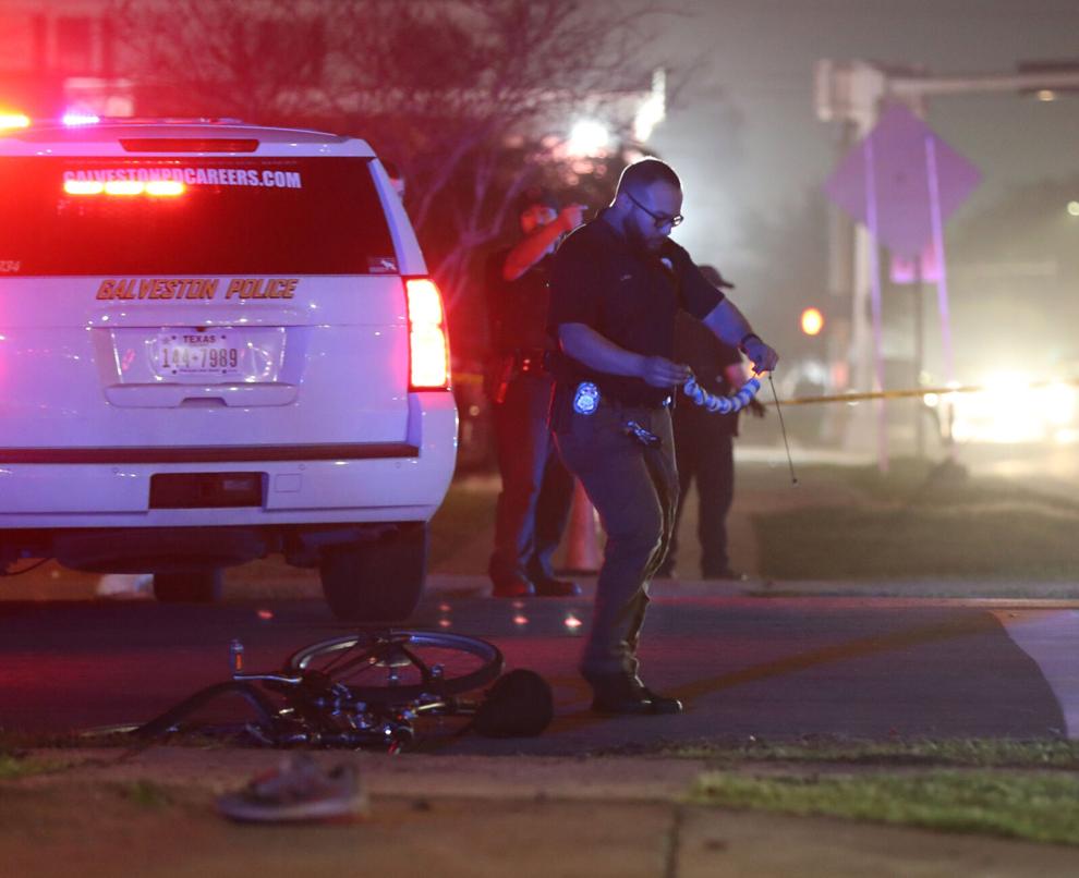 Galveston police officers investigate the scene of a hit and run at Broadway and 36th Street on Wednesday, Feb. 22, 2023.