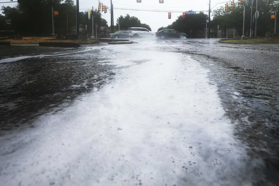 Foamy water runs off along Vance Jackson after an impromptu shower comes down on Tuesday, Aug. 22, 2023. The brief showers were remnants of Tropical Storm Harold that made landfall on the South Texas coastline on Tuesday.
