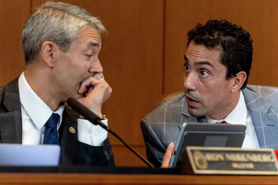 District 10 Councilmember Marc Whyte, right, confers with Mayor Ron Nirenberg during a City Council special session in Council Chambers on Thursday, Nov. 30, 2023. Thursday’s meeting was council’s last work session ahead of the Dec. 7 vote on a proposed CPS Energy rate hike.