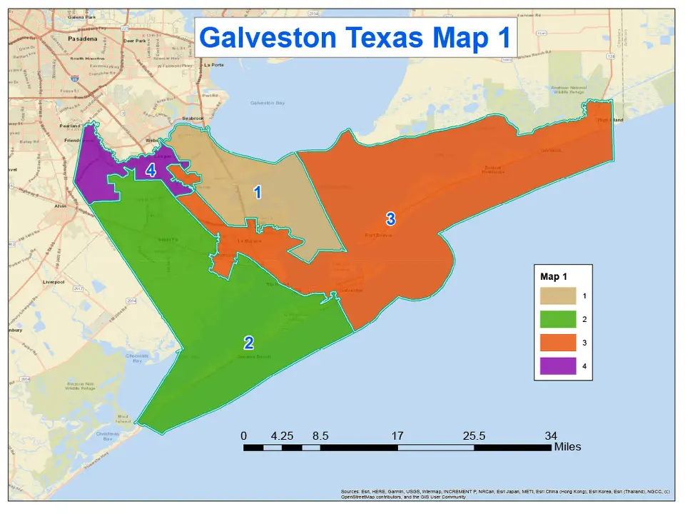 Hence, Galveston Texas Map 1. But why? During the trial, the Galveston County Daily News reported, an expert witness for the plaintiffs suggested the commissioners had redrawn the map out of pure mean-spiritedness, calling their efforts “a textbook example of racial gerrymander…I have never seen anything this bad. Because normally if a majority-minority district is in place, then you are not going to see a locality attempt to eliminate it unless [it] had no choice due to demographic changes.”