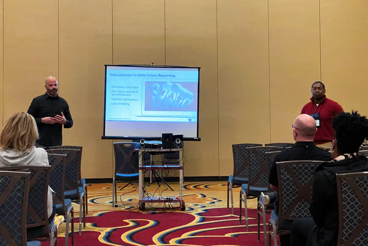 Cpls. Chris Holder and Jastin Williams present their hate crimes training at the International Law Enforcement Educators and Trainers Association Conference & Expo in St. Louis on March 21, 2023.