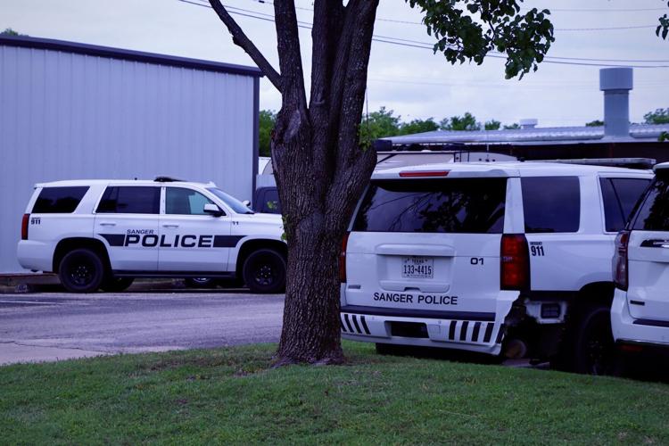 Sanger Police Department vehicles are parked outside the police station at 209 N. Fifth Street in May.