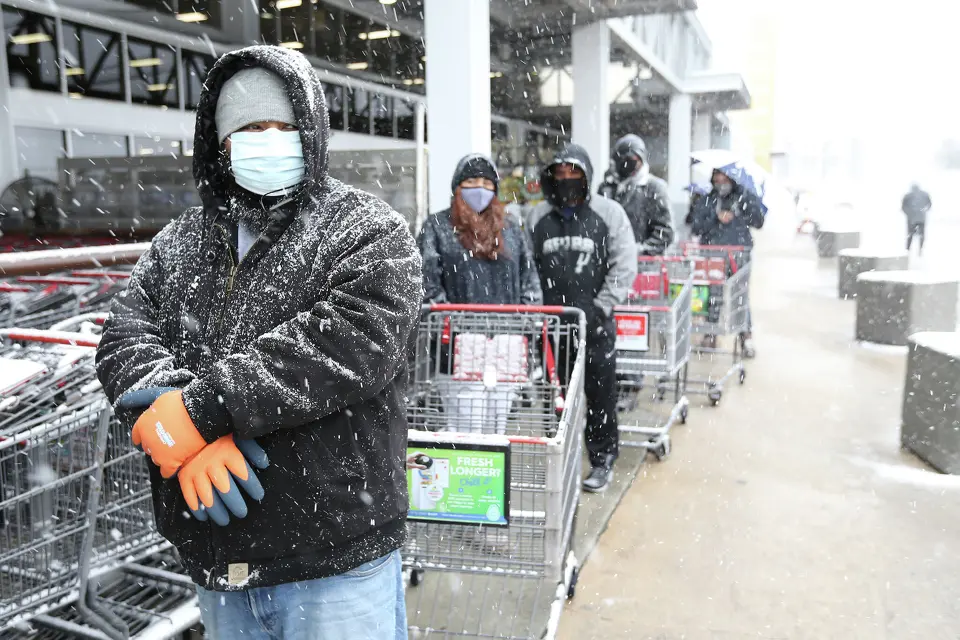 Alex Vega, left, waits with others to shop at the HEB on Wurzbach Road during another day of snow fall in San Antonio on Feb. 18, 2021. The storm, commonly referred to as Winter Storm Uri, plunged San Antonio into freezing temperatures for days and resulted in power outages and dozens of deaths. A new study concludes that the Texas power grid relies too heavily on natural gas to restart from blackouts.