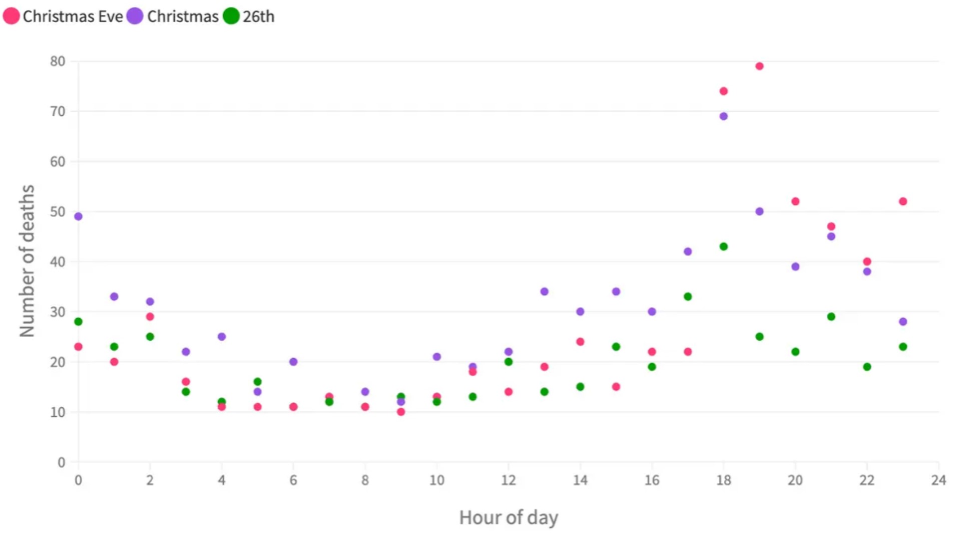 - The hours from 6 p.m. to midnight on Christmas Eve make up the deadliest six-hour stretch of the holiday period, with the most fatal crashes per hour seen from 6-8 p.m.