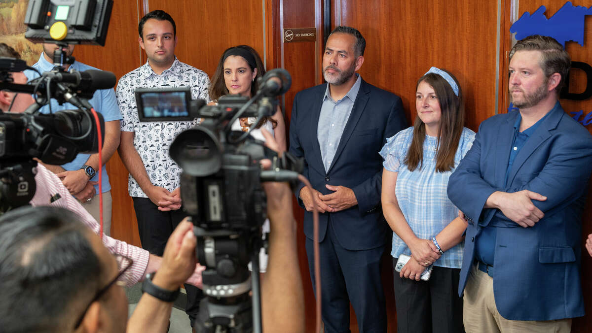 Tommy Gonzalez, middle, answers questions from local media about becoming Midland's next city manager