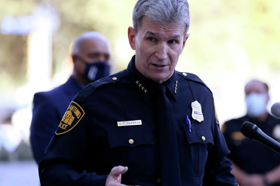 San Antonio Police Chief William McManus addresses media during a news conference in front of police headquarters downtown in on Jan. 4, 2021.