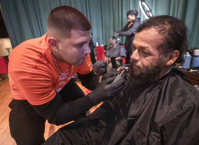 College of the Mainland barbering student Emilio Filoteo provides a beard trim for Eric Valdez at the inaugural Homeless Navigation Day at the Nessler Center in Texas City on Thursday.