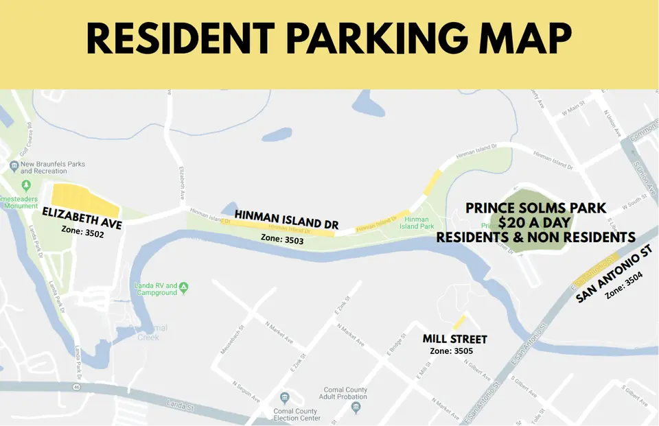 The City of New Braunfels offers a free resident parking pass, which will allow them to park in the pay-to-park lots on Elizabeth Street, Hinman Island Drive, and San Antonio Street. The parking pass does exclude parking on Prince Solms. Without a pass, parking at those lots would cost anywhere between $10 and $30 dollars.